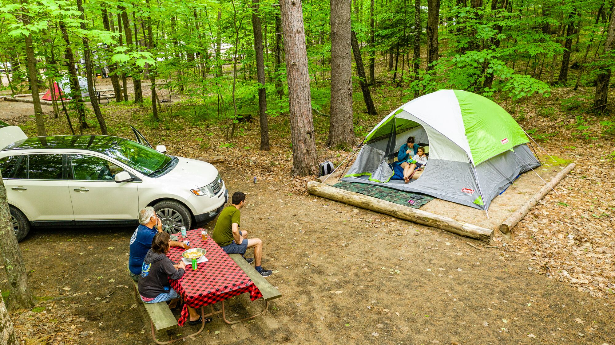 Upgrade your tenting experience with a Deluxe Tent site. Nestled among the trees, these sites feature a picnic table, fire ring, electricity, and a convenient charging station. Relax, unplug, and enjoy.